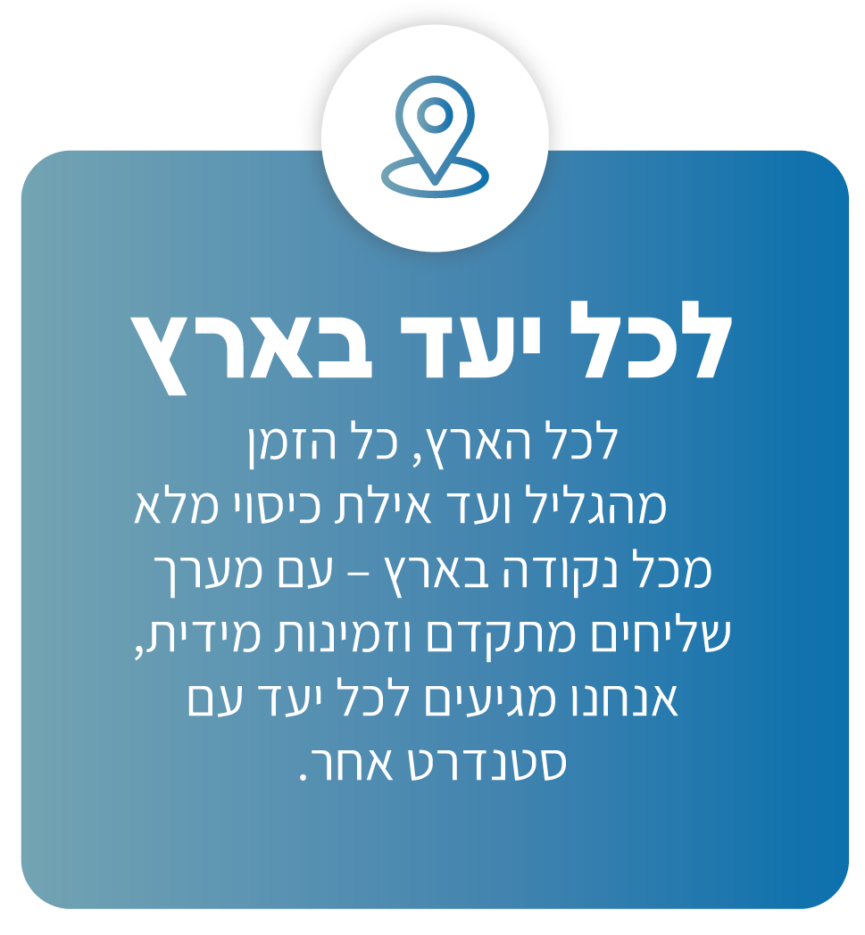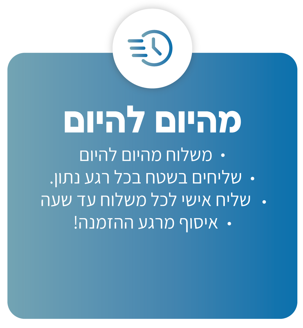 אנחנו כאן כדי להקל עליך – עם שליחים שמגיעים בדיוק כשצריך, שירותים מותאמים אישית, ומענה זמין גם אחרי שעות הפעילות ובשבת.