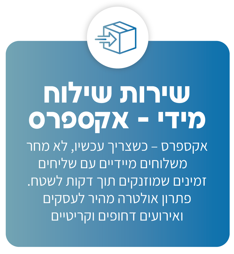 אנו מתחייבים לשירות אמין, מהיר, מקצועי ובמחיר משתלם, עם מערך שליחים איכותי שמספק תוצאות – מהיום להיום, מהשטח ליעד, בדיוק ובזמן.